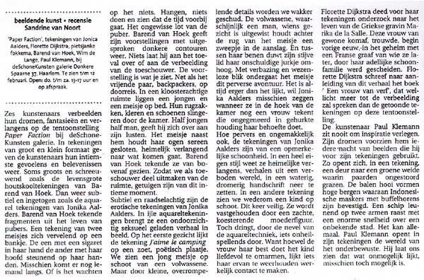 Paper Faction Jonika Aalders, Florette Dijkstra, pietsjanke fokkema, Barend van Hoek, Wim de Lange en Paul Klemann. Tekeningententoonstelling opening: zondag 23 januari 1600 uur Exposerende kunstenaar(s): | 1 ![]() | 2 ![]() | 3 ![]() | 4 ![]() | 5 ![]() | 6 ![]() | Haarlems dagblad 25-01-05 ![]() |